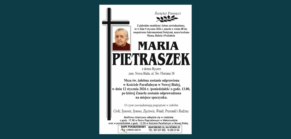 Z głębokim smutkiem i żalem zawiadamiamy, że w dniu 9 stycznia 2026 roku zmarła w wieku 88 lat Maria Pietraszek z domu Rycerz, zamieszkała w Nowej Białej przy ul. Św. Floriana 38, o czym informują: córki, synowie, synowe, zięciowie, wnuki, prawnuki i rodzina.